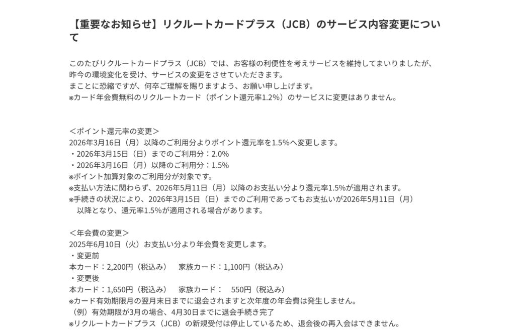 長らく愛用していたリクルートカードプラスですが、来年以降還元率が2%→1.5%になると
